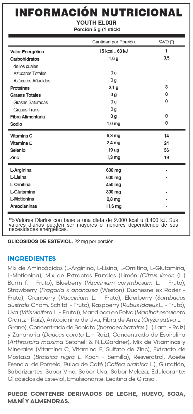 Combinación de aminoácidos con antioxidantes naturales como el resveratrol, café verde y super frutos como el blueberry, cranberry, elderberry entre otros, además de Minerales como el Selenio de mostaza y Zinc; que trabajan en sinergia para reducir los radicales libres en diferentes partes del organismo. Estos ingredientes son reconocidos por nutrir la glándula pituitaria, responsable de segregar la llamada hormona de la juventud.